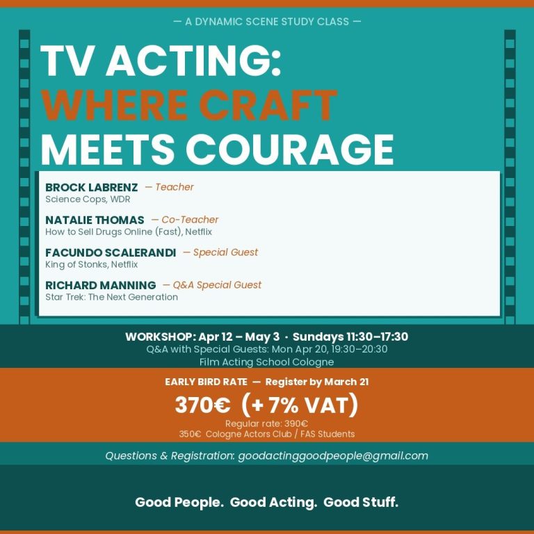 Wir bringen Euch internationale Menschen aus unserem Business nach Köln, damit ihr auch als ausgebildete Schauspieler:innen auf hohem Level weiter trainieren könnt.